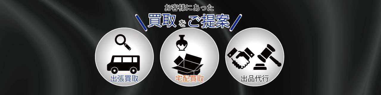 近場にお住まいのお客様で、現地での買取り査定をご希望であれば出張買取を、遠方のお客様・ライフスタイルの関係上宅配をご希望の方は宅配買取を、そして出品代行という形でオークションにお品物を出したいという方は出品代行を。